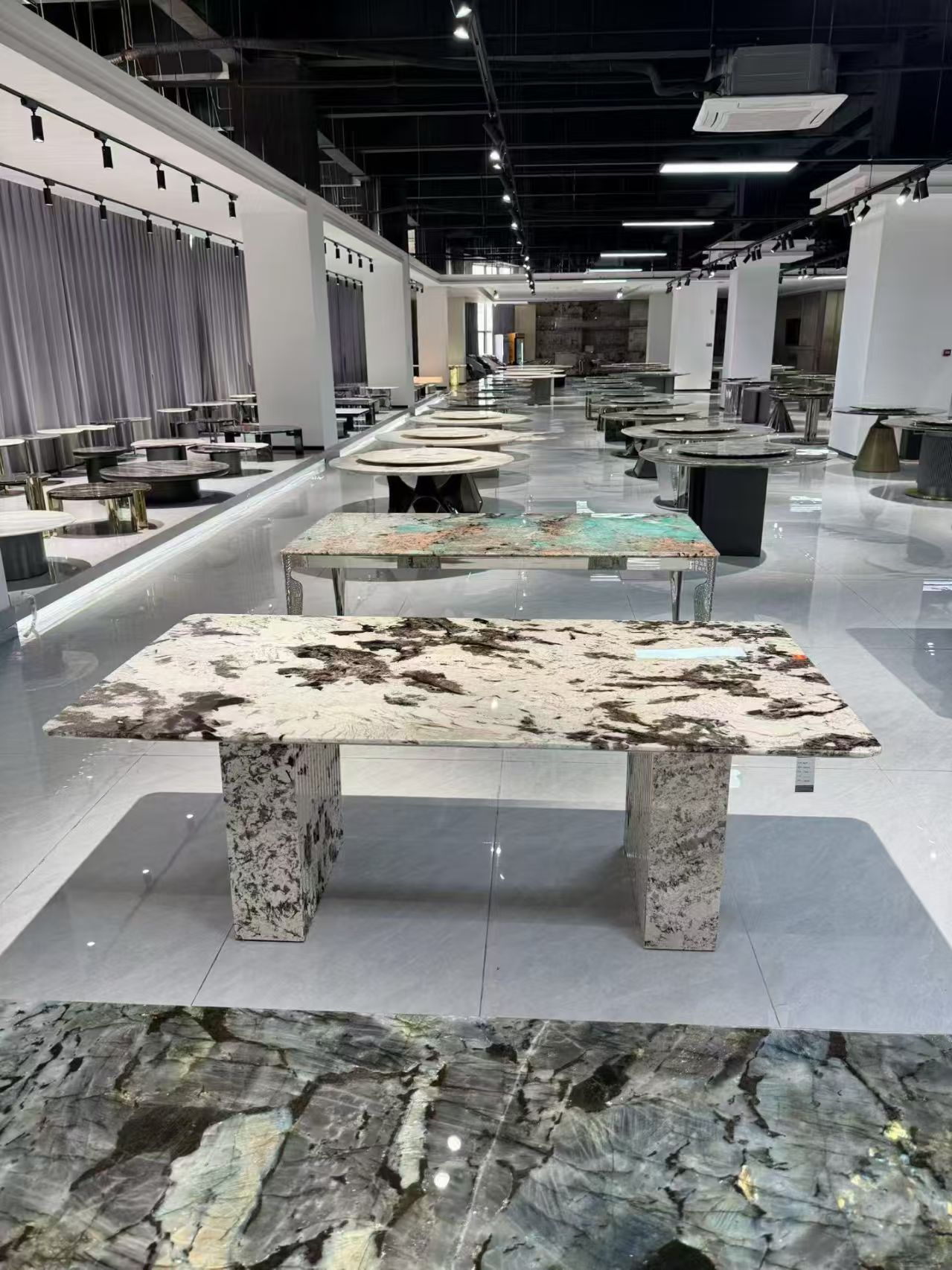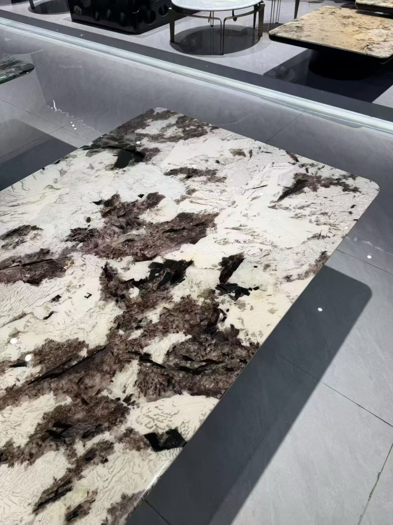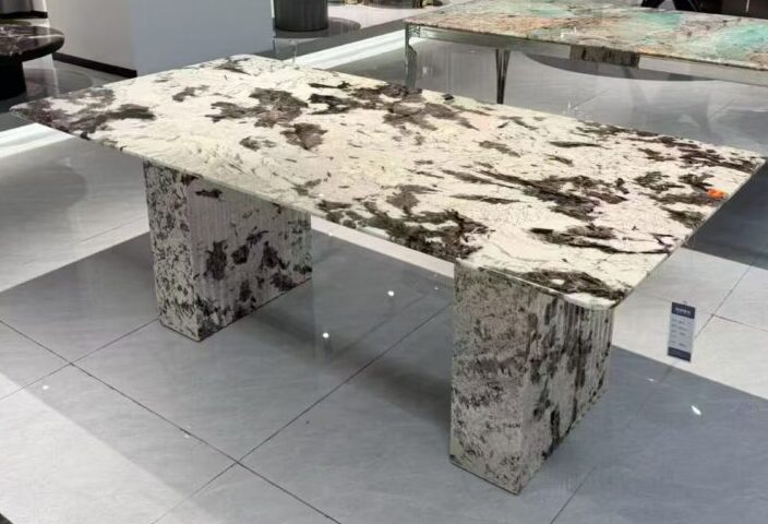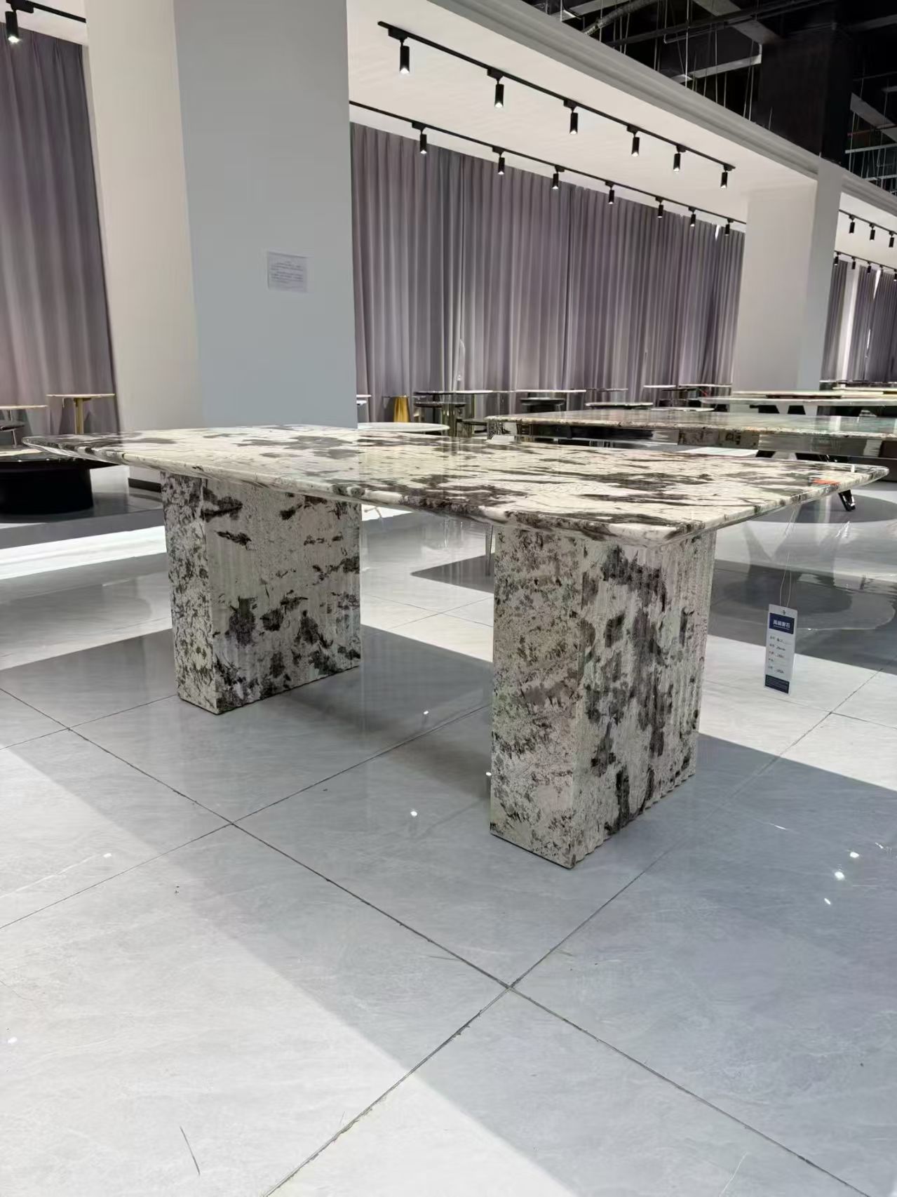This dining table features a unique natural marble-patterned tabletop, with light gray base color interwoven with dark ink-like textures—blending artistic charm and premium quality.